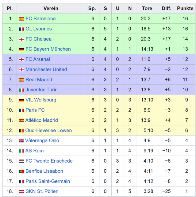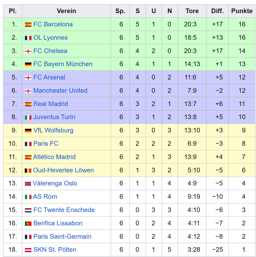 Die CL-Tabelle der Frauen - Stand 2.4.2026