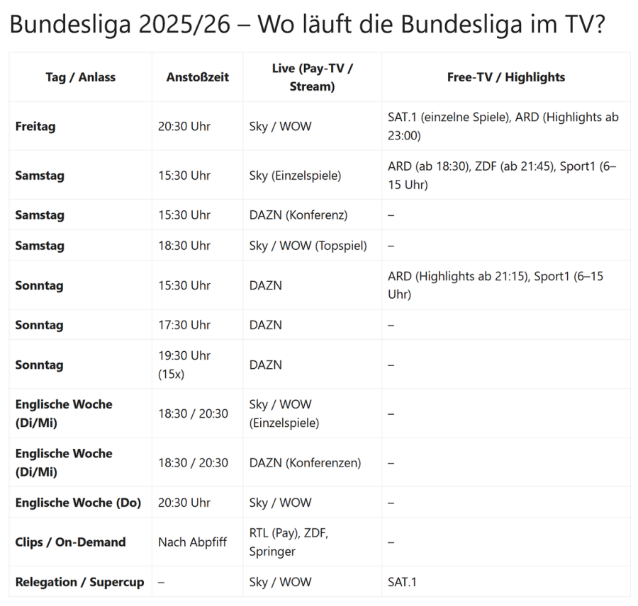 Seit der Saison 2025/26 bekommen Fußballfans in Deutschland eine klare Struktur für die TV-Übertragungen der Bundesliga. Die Rechte sind neu verteilt, die Anstoßzeiten weitgehend fixiert – und sowohl Pay-TV- als auch Free-TV-Zuschauer wissen nun genau, wann und wo sie einschalten müssen.