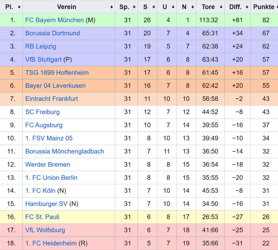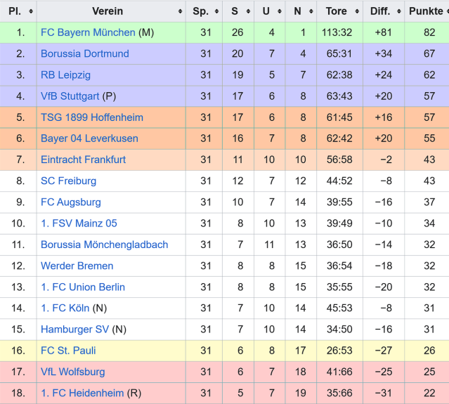Stand nach dem 31. Spieltag (24. bis 26. April 2026 )