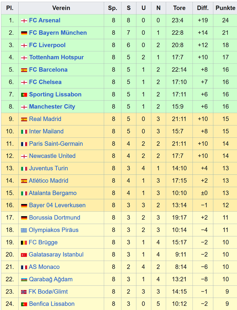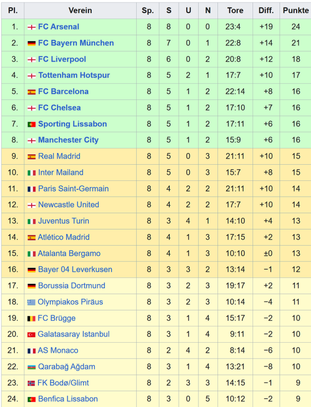 Und hier die CL-Liga-Tabelle - nach dem 8. Spieltag