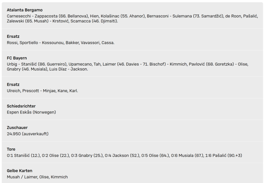 Josip Stanišić (zwölfte Minute), Michael Olise (22.) und Serge Gnabry (25.) trafen für die Münchner bereits im ersten Durchgang im stimmungsgeladenen Stadion bei den eigentlich so heimstarken Bergamaschi. Nicolas Jackson (52.), Olise (64.) und Jamal Musiala (67.) schraubten das Ergebnis in Halbzeit zwei in die Höhe. Mario Pašalić (90.+3) erzielte noch den Ehrentreffer der Hausherren.