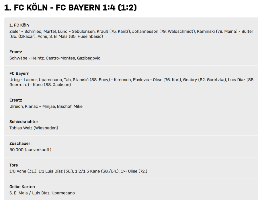Nach dem Rückstand durch einen Treffer von Ragnar Ache (31. Minute) drehte der FCB die Partie durch einen Doppelschlag von Luis Díaz (36.) und Harry Kane (38.) innerhalb von zwei Minuten.