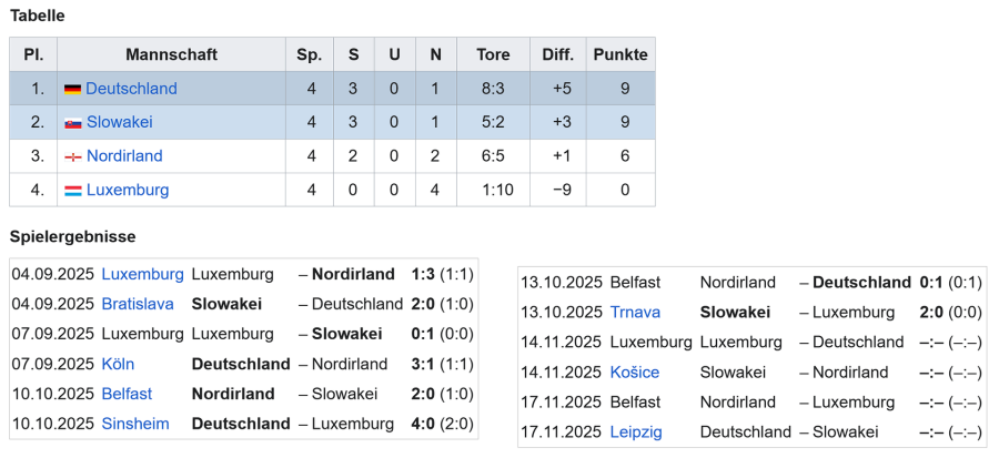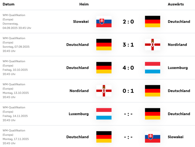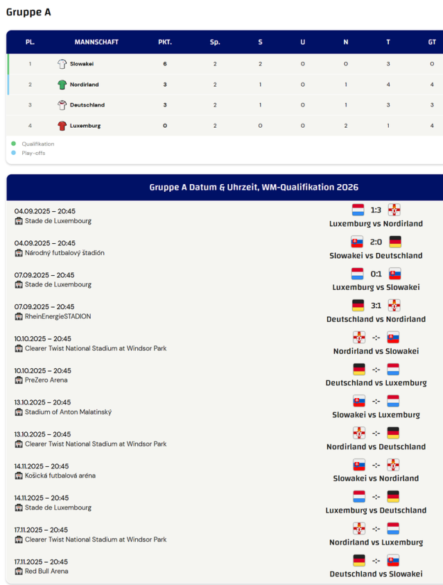 In 6 Spielen zwischen 4. September und 17. November 2026 spielt das DFB-Team gegen Slowakei, Nordirland und Luxemburg um den Gruppensieg und die direkte Qualifikation für die WM-Endrunde in USA, Kanada und Mexiko.