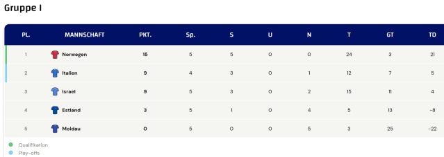 Auch Italien hat in seiner Gruppe, unter anderem mit Norwegen und Isreal, zu kämpfen. Drei von vier Partien konnte die Gattuso-Elf zwar gewinnen, die Norweger liegen mit einem Spiel mehr jedoch gleich sechs Punkte vor der Squadra Azzurra.
